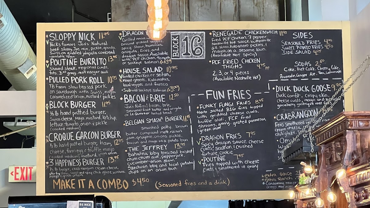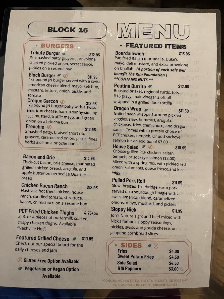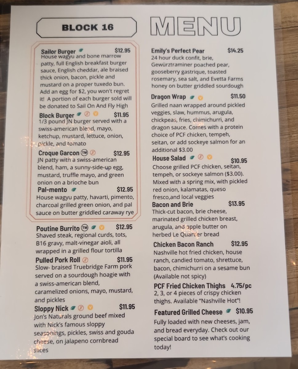 Block 16 offers a menu that blends classic American comfort food with thoughtful, modern twists, perfect for casual meals any time of day. Whether you're grabbing a quick takeout sandwich or settling in for a relaxed meal, the menu is thoughtfully crafted to complement its laid-back, neighborhood vibe.